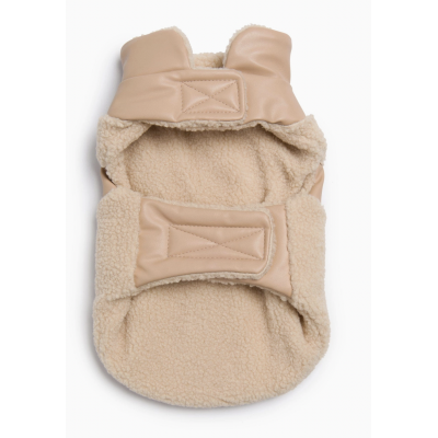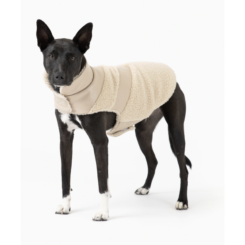 Inspiré par le style après-ski ,ce manteau en cuir végétalien et shearling garde les chiens au chaud, élégants et prêts pour les aventures hivernales.